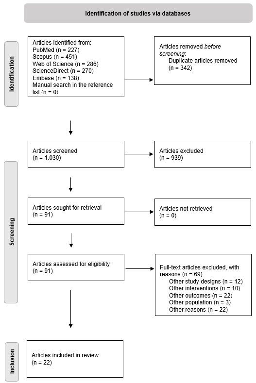 1,372 articles were found in the first database search, 138 in Embase (Elsevier), 286 in Web of Science – Core Collection, 451 in Scopus, 270 in ScienceDirect and 227 in PubMed. 342 articles were excluded because they were cross-references. After reading titles and abstracts, 939 articles were excluded for not meeting the inclusion criteria. Upon full reading, 22 articles were eligible for this review28-49 (Figure 1).