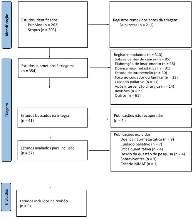 Essa busca foi conduzida em dezembro de 2023 nas bases de dados PubMed e Scopus, sem restrição de idioma, utilizando-se as palavras-chave, indicadores booleanos e filtros seguintes: “qualitative” [title/abstract] AND “quality of life” [title] AND “cancer” [title] NOT (children OR childhood). Foram obtidos 262 achados na PubMed e 303 na Scopus.