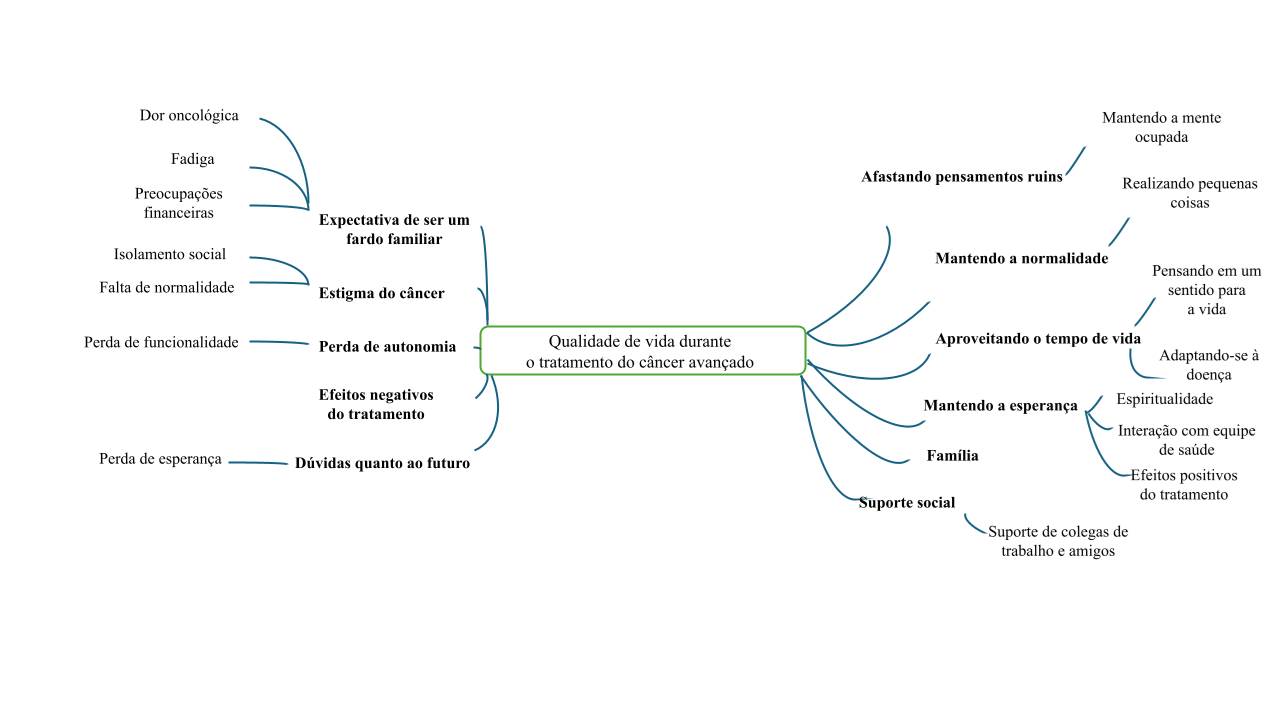 Dois temas foram explorados: impacto do câncer metastático sobre a QV, e tratamento e necessidade de suporte. Sintomas ou efeitos sobre a esfera física comprometeram a QV, destacando fadiga. Continuar a trabalhar ou estabelecer metas ajudou a QV. Problemas emocionais como depressão e ansiedade tiveram impacto na QV. Sob o tema de necessidade de suporte, exames geram ansiedade e reduzem o tempo disponível no dia-a-dia. Assistência social e suporte psicológico oportuno foram outras necessidades |
