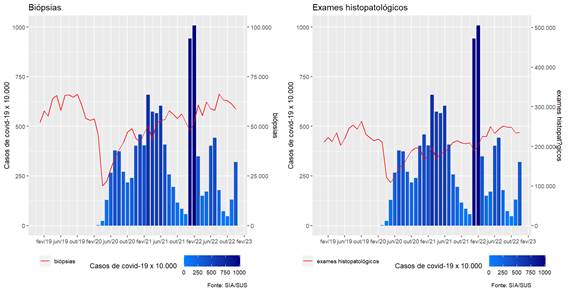 Figura 2. Número de biópsias e exames histopatológicos e casos confirmados de covid-19 segundo meses do ano. Brasil, 2019-2022