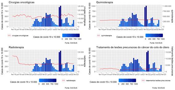 Gráficos mensais foram criados usando o software R versão 4.3.121 para representar o fornecimento de procedimentos e casos confirmados de covid-19.