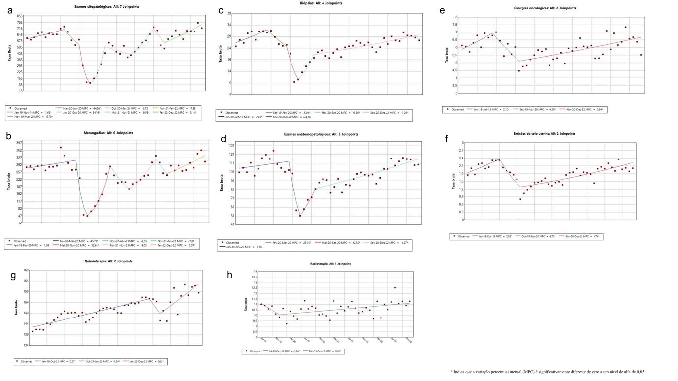 Foram calculadas as taxas brutas mensais de realização de cada procedimento, dividindo-se o número de procedimentos registrados pela população brasileira residente e multiplicando-se por 100 mil. As taxas de exames de rastreamento dos cânceres de mama e do colo do útero foram calculadas utilizando-se como denominador a população feminina. A variação percentual média mensal (VPMM) e os respectivos intervalos de confiança de 95% (IC95%) foram calculados para cada procedimento, para indicar o aumento ou a diminuição mensal, bem como a magnitude das mudanças durante o período. A análise de tendência foi realizada pela regressão Joinpoint, utilizando o software Joinpoint Regression (versão 5.0.2)22.