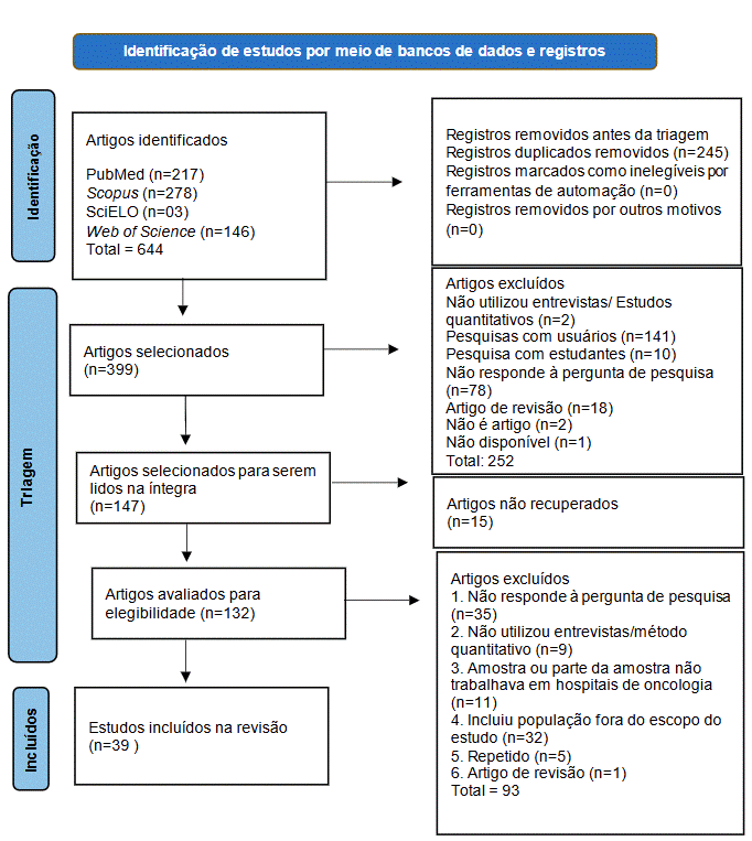 Foram identificados 644 estudos, sendo 217 na PubMed, 278 na Scopus, 3 na SciELO e 146 na Web of Science. Após a exclusão dos 245 estudos duplicados, restaram 399 artigos selecionados para a leitura dos títulos e resumos. Feita a aplicação dos critérios de elegibilidade, 147 artigos foram elencados para serem lidos na íntegra, dos quais 15 artigos não foram recuperados e 93 foram excluídos. Assim, 39 estudos compuseram a amostra final do estudo. O fluxo do processo de seleção dos estudos é ilustrado na Figura 1, elaborada com base no Fluxograma Prisma 202014.
