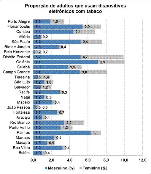 Na Região Norte, as maiores proporções de adultos que usam dispositivos eletrônicos com tabaco foram em Palmas (6,3%) e Rio Branco (3,4%). Para a Região Nordeste, a maior proporção foi em homens na maioria das capitais, com exceção de Salvador (0,8%), Teresina (0,5%) e João Pessoa (0,3%). Na Região Centro-Oeste, a maior proporção foi observada entre os homens, especialmente em Goiânia (7,1%). No caso das mulheres, o Distrito Federal apresentou o maior percentual (4,7%). Para a Região Sudeste, a proporção variou de 0,2% a 5,2%. A cidade de São Paulo, tanto entre os homens (5,2%), quanto entre as mulheres (2,4%), apresentou as maiores proporções. Por fim, na Região Sul, a maior proporção foi nos homens, especificamente em Florianópolis (5,4%). Nas mulheres, a cidade de Curitiba apresentou o maior percentual (2,4%) (Figura 2).