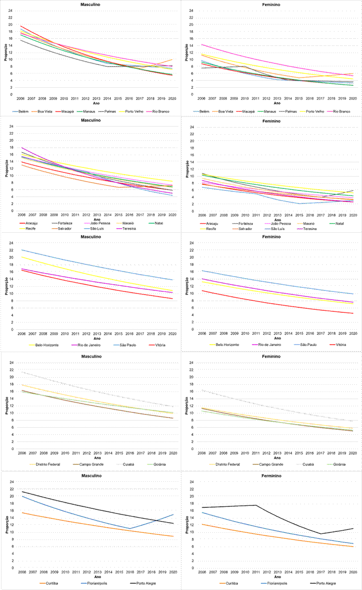 A análise da tendência das proporções de adultos fumantes revela que houve uma queda significativa ao ano para todas as capitais das Regiões brasileiras, no período de 2006 a 2020. Quando estratificado por Região, verificou-se que a Região Norte possuía a maior queda, sendo observada em Macapá, na população masculina (-9%) e em Manaus para as mulheres (-9%). Na Região Nordeste, a tendência variou com -9% em Teresina e -4% em Salvador para a população masculina, e -8% em Teresina e -4% em Fortaleza na população feminina. A Região Centro-Oeste mostrou que, tanto para os homens quanto para as mulheres, houve uma queda significativa ao ano (variando de -6% a -3%) para todas as capitais. Para a Região Sudeste, observou-se que a cidade de Vitória apresentou a menor redução (cerca de -5% ao ano nos homens e -6% ao ano nas mulheres). Por fim, na Região Sul, observou-se uma queda expressiva para todas as capitais, ambos os sexos, variando em média de -2% a -6% ao ano (Tabela 1 e Figura 3). Ao analisar os RCBP da Região Norte, observou-se que as tendências das taxas de incidência do câncer de pulmão em Belém e Manaus tiveram uma queda média de 3% ao ano, para o período referido, entre os homens, enquanto, para as mulheres, pode-se dizer que as taxas de incidência se mantiveram estáveis.