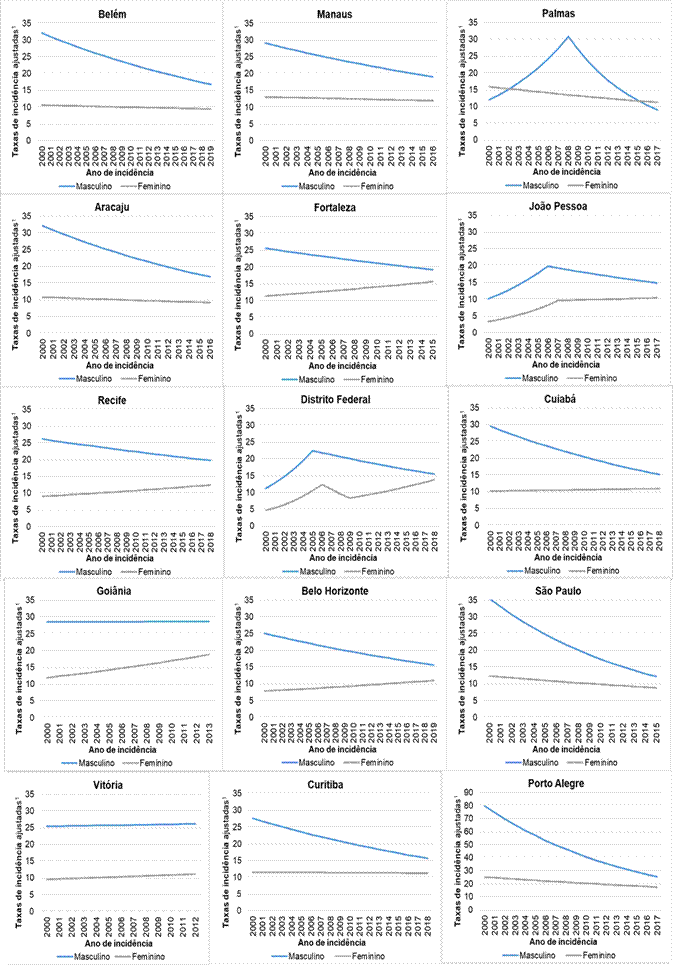 As taxas de incidência foram ajustadas por idade pela população padrão mundial de 196013,14. O denominador para calcular as taxas de incidência foram usadas as populações censitárias (2000 e 2010) e intercensitárias (2001 a 2020) das capitais selecionadas15.