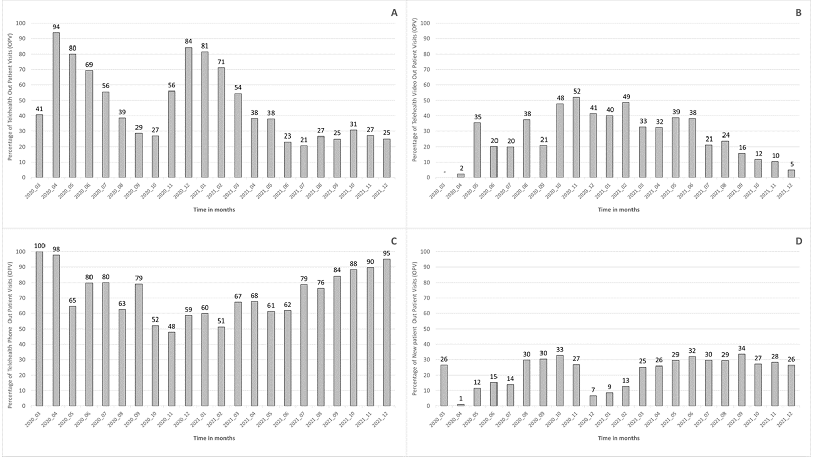Figure 1. Percentage of telehealth distribution, (A) monthly percentage of telehealth-OPV; (B) monthly percentage of telehealth video-OPV; (C) monthly percentage of telehealth phone-OPV; (D) monthly percentage of new patients-OPV. March 2020 to December 2021