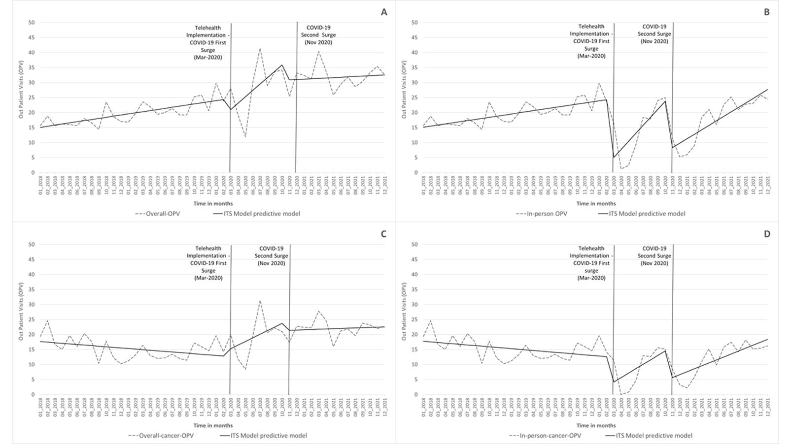 Figure 2. Interrupted time series for monthly overall-OPV (A); monthly in-person-OPV (B); monthly overall-cancer-OPV (C); (D) monthly in-person-cancer-OPV (D), denoted by first surge of COVID-19 cases (March 2020) and second surge of COVID-19 cases (November 2020), from January 2018 to December 2021