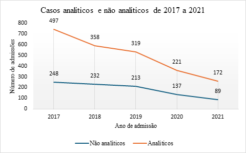 No período pré-pandemia, a redução de admissões ficou em torno de 20% entre 2017 e 2018 e de 10% no ano seguinte. Quando avaliada a proporção de queda nas admissões entre 2019 e 2020, o primeiro ano da pandemia do coronavírus, observou-se um valor aproximado de 32%; e 51% quando avaliada a queda proporcional em 2021, em comparação com 2019. A distribuição entre pacientes analíticas e não analíticas permaneceu estável durante todo o período do estudo, mantendo-se em torno de 35% a 40% das pacientes não analíticas. O Gráfico 1 demonstra a queda evolutiva nas admissões tanto de casos analíticos quanto não analíticos ao longo desse período.