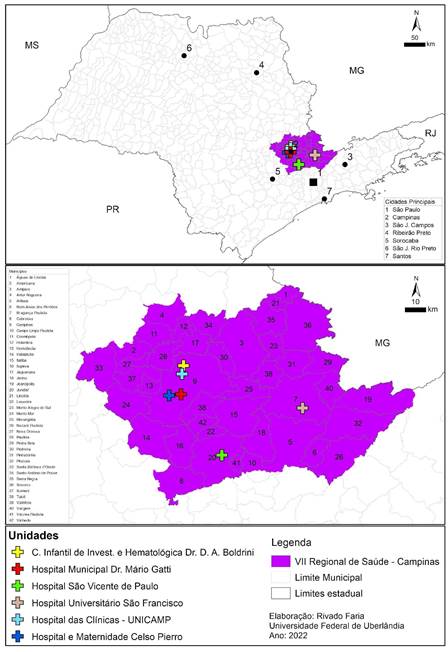 O município de Campinas está localizado na Região Centro-Oeste do Estado de São Paulo, ocupa uma área de 795,70 km², e está situado 96 km a Noroeste da capital. De acordo com o Censo Populacional de 2022 (IBGE, 2022), a população de Campinas foi de 1.139.047, com densidade demográfica (habitantes/km²) de 1.372,31. Campinas é a sede do DRS 7, fazendo parte da divisão político-administrativa da Secretaria de Estado da Saúde (SES), juntamente com mais outros 42 municípios, compondo também a Região Metropolitana de Campinas. Com isso, sabe-se que a cidade de Campinas está produzindo informações a respeito da incidência de câncer em crianças, adolescentes e adultos jovens, como também possui informações sobre o atendimento prestado aos usuários na rede hospitalar.