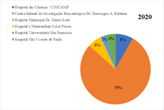 Na Figura 2, observa-se que tanto em 2000 quanto em 2020 o C.I.I.H. Boldrini concentrou o maior número de pacientes atendidos, seguido do Hospital de Clínicas Unicamp. Destaca-se o aumento da representatividade do C.I.I.H. Boldrini no período de 2020, que passou de 59% em 2000 para 79%.