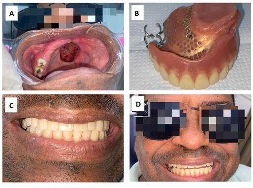 Captions: A = patient without the prosthesis; B = final molding and completed prosthesis; C and D = upper obturator prosthesis implanted.