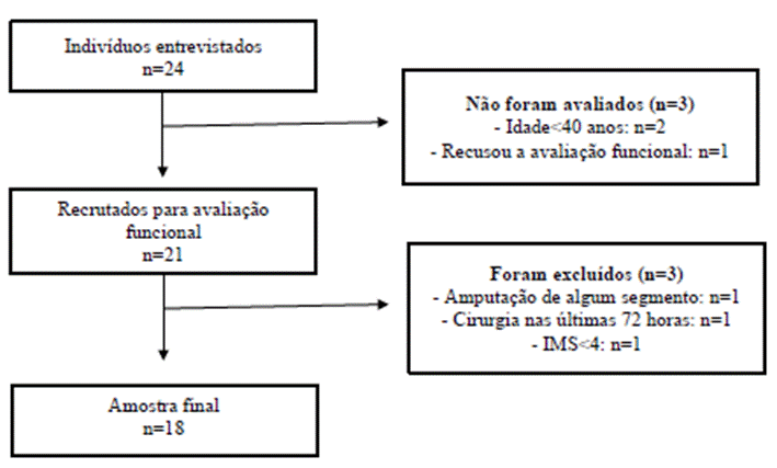 Inicialmente, foram entrevistados 24 indivíduos, dos quais 6 foram excluídos por não cumprirem os critérios de elegibilidade, ficando a amostra final constituída por 18 indivíduos (Figura 121).