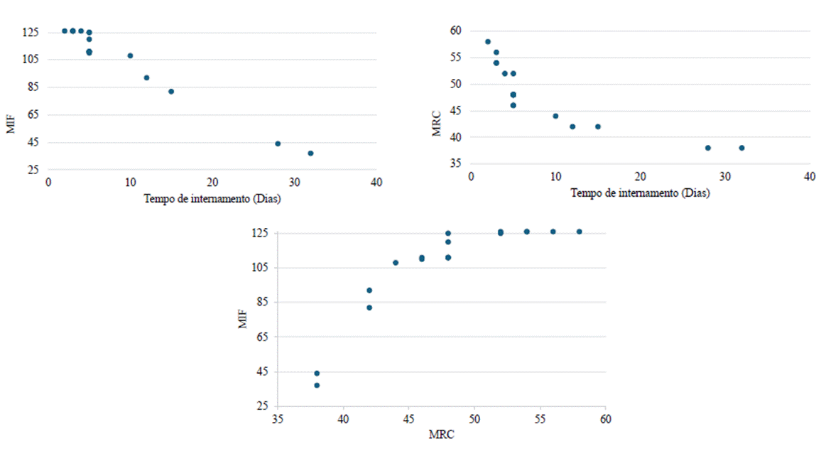 O gráfico gerado pela correlação revela uma relação forte e positiva entre a força muscular periférica e o estado funcional (ρ = 0,954; r = 0,891; p<0,01), ou seja, quanto maior a força muscular, maior é a independência funcional do indivíduo (Figura 2). A correlação entre as variáveis tempo de internamento e força muscular periférica (ρ=0,953; r=0,886; p≤0,01), e tempo de internamento e estado funcional (ρ=0,917; r=0,869; p≤0,01) revela uma relação forte e negativa, ou seja, quanto mais dias de internamento, menor é a força muscular periférica e independência funcional do indivíduo (Figura 2).