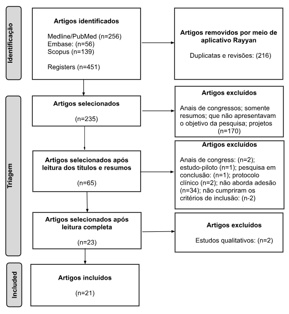Ao todo, foram encontrados 451 artigos nas bases de dados selecionadas, sendo 216 removidos na fase de identificação da seleção. Na fase de triagem, 214 não atenderam aos critérios de inclusão, resultando em uma amostra com 21 artigos (Figura 1).