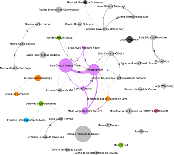 Por fim, a métrica de PageRank evidencia os autores que têm um papel de liderança na rede de autores da RBC, provavelmente resultado de suas atividades como mentores de novos pesquisadores nessa área. De acordo com essa métrica, ficam em evidência os autores Anke Bergmann (rank = 3), Luiz Claudio Santos Thuler (rank = 2) e Mario Jorge Sobreira da Silva (rank = 4).