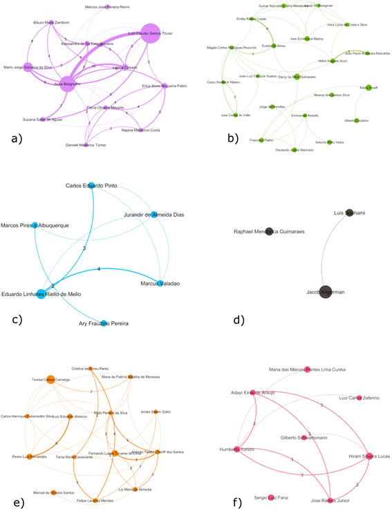 A Figura 2 apresenta uma análise detalhada das seis maiores redes de coautoria consolidadas ao longo da história da RBC. Considerando que essas comunidades possuem, em média, 100 membros, optou-se por destacar apenas os autores com cinco ou mais publicações, permitindo assim uma análise mais precisa dos núcleos de cada comunidade.