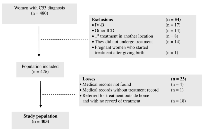 Exclusion criteria were women whose treatment protocol was defined and implemented outside Rio Branco, who presented tumors other than epithelial, those who had neoplasms in a second primary site, pregnant women who waited until the end of pregnancy to start treatment, and those at stage IVB because the treatment was palliative and not curative. Thus, among the 480 women identified according to ICD C53 in the hospitals' databases, 54 (11.25%) were excluded. Of the 426 patients included in the study, there were 23 losses (5.3%). Thus, the study population consisted of 403 women with cervical cancer (Figure 1).
