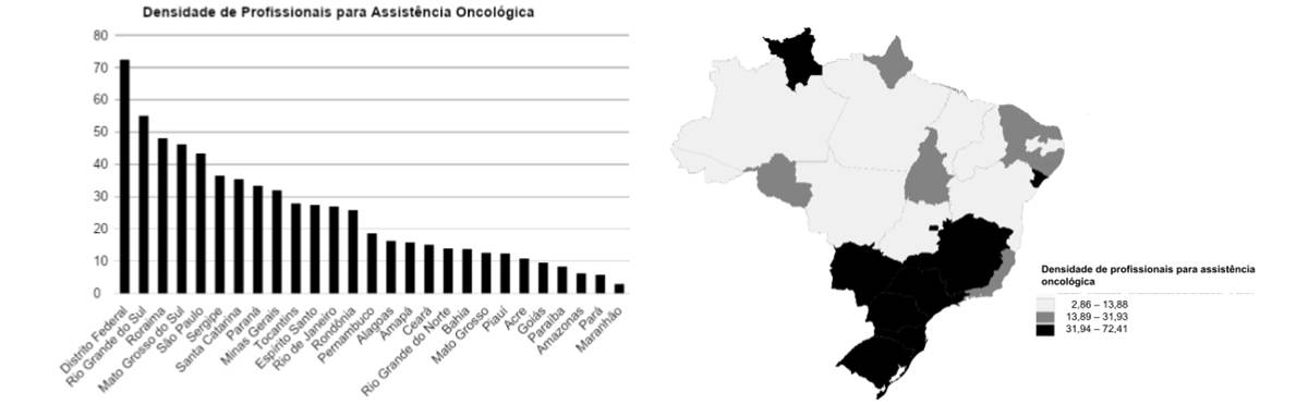 A distribuição da FTS para atenção oncológica é feita de forma irregular no território brasileiro. Os profissionais estão alocados, essencialmente, nas Regiões Sul e Sudeste do país, onde se destacam os Estados do Rio Grande do Sul (55,0 profissionais para cada 100 mil habitantes), São Paulo (43,4 profissionais para cada 100 mil habitantes) e Paraná (33,3 profissionais para cada 100 mil habitantes). Além destes, destacam-se o Distrito Federal (72,4 profissionais para cada 100 mil habitantes), Mato Grosso do Sul (46,1 profissionais para cada 100 mil habitantes) e Roraima (48,0 profissionais para cada 100 mil habitantes), localizados nas Regiões Centro-Oeste e Norte (Figura 1).