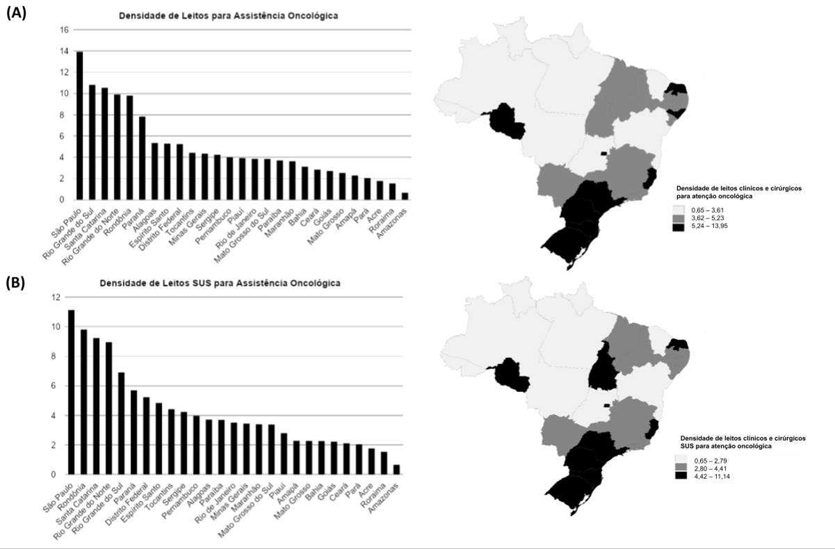 A análise da distribuição de leitos clínicos e cirúrgicos para assistência oncológica no Brasil revela uma distribuição territorial irregular. As Regiões Sul e Sudeste seguem apresentando as maiores densidades de leitos para assistência oncológica, incluindo a assistência privada. Em tais Regiões, São Paulo (13,9 leitos oncológicos por mil habitantes), Rio Grande do Sul (10,8 leitos oncológicos por mil habitantes) e Santa Catarina (10,5 leitos oncológicos por mil habitantes) se destacam com as maiores densidades de leitos para assistência oncológica do país (Figura 2).