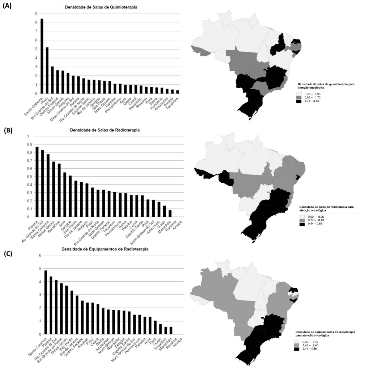 Figura 3. Densidade de salas de quimioterapia e radioterapia e de equipamentos de radioterapia em uso para assistência oncológica no Brasil (por UF), de acordo com dados do CNES para o ano de 2021