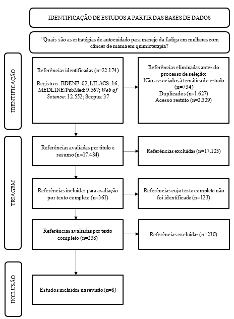 A revisão teve como pergunta norteadora: “Quais as estratégias de autocuidado para manejo da fadiga em mulheres com câncer de mama em quimioterapia?”, seguindo o acrônimo PICo, sendo: P “População” (mulheres com câncer de mama em quimioterapia); I “Fenômeno de Interesse” (estratégias de autocuidado para manejo da fadiga); Co “Contexto” (Tratamento quimioterápico do câncer de mama).
