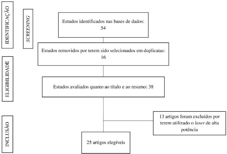 Após a aplicação dos critérios de elegibilidade e a análise do conteúdo completo dos artigos selecionados, foram incluídos 25 estudos que utilizaram a FBM como intervenção terapêutica para diferentes disfunções pélvicas femininas. Considerando que não foram identificados estudos robustos metodologicamente sobre o tema e que os estudos disponíveis apresentam heterogeneidade quanto aos equipamentos utilizados, aos parâmetros aplicados e à associação com outros recursos, optou-se por apresentar os achados em formato de análise descritiva. As principais informações reportadas nos artigos incluídos foram organizadas no Quadro 18,11-34.