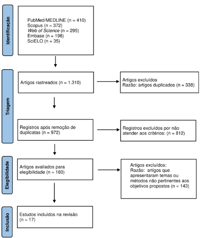 Foram excluídos trabalhos duplicados; resumos, cartas ao editor, opiniões sem embasamento científico; estudos com amostras exclusivamente animais ou modelos celulares in vitro.