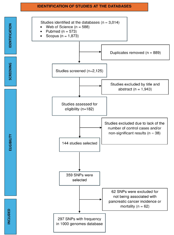 An extensive literature search was undertaken to identify eligible studies published up to August 25, 2024 across PubMed, Scopus, and Web of Science databases. The full search strategy, including the use of Medical Subject Headings (MeSH) is provided in Table S1 of the Supplementary Material. To ensure the inclusion of the most recent studies, automated alerts were configured in each database to flag newly published articles that met the predefined search parameters. The inclusion criteria were GWAS, cohort studies, case-control studies, and meta-analyses that correlated SNPs with risk, incidence, mortality, prognosis, or susceptibility to pancreatic cancer published in English, Portuguese, or Spanish. The exclusion criteria were studies that did not specifically investigate pancreatic cancer or evaluated other cancer types, as well as studies lacking sufficient data for genetic association analysis. Retrieved records were imported into EndNote® reference management software (version X7, Thomson Reuters, Philadelphia, USA), and duplicate entries were eliminated through both automated detection and manual review. Title and abstract screening was conducted independently by two reviewers and discrepancies were resolved by consensus and, when necessary, in consultation with the senior author.