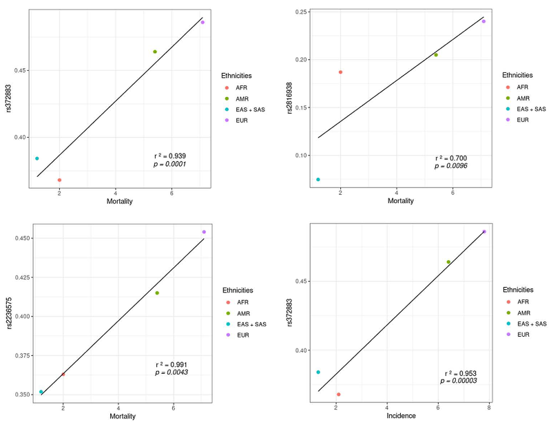 Of the 15 significant variants related to mortality, three extremely significant variants have been identified: rs2816938, rs372883, and rs2236575. These variants are presented in Figure 3, a graph that correlates the allele frequency of each one in the four populations analyzed in relation to incidence and mortality rates.