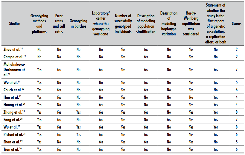 In addition, the Strengthening the Reporting of Genetic Association Studies (STREGA)11 guidelines were employed to assess the quality of reporting. These recommendations are structured into five core domains: genotyping methods and associated errors, population stratification, haplotype variation, Hardy–Weinberg equilibrium, and replication. The first domain encompasses five distinct criteria: genotyping platform, error and call rates, batch genotyping procedures, genotyping center or laboratory, and the number of successfully genotyped individuals – totaling nine evaluative items. To quantify reporting quality, one point was attributed to each item, resulting in a score ranging from 0 to 9, with higher values reflecting superior reporting rigor. This assessment was independently conducted by three reviewers, discrepancies were resolved in consultation with the senior author.