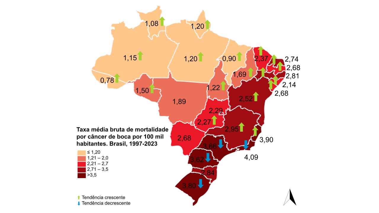 A análise das tendências de mortalidade ao longo de mais de duas décadas revelou tendência geral estacionária, porém com expressiva heterogeneidade entre Regiões, Estados, faixas etárias, níveis de escolaridade e cor/etnia, o que reforça a complexidade epidemiológica do câncer de boca e suas interações com as desigualdades em saúde.