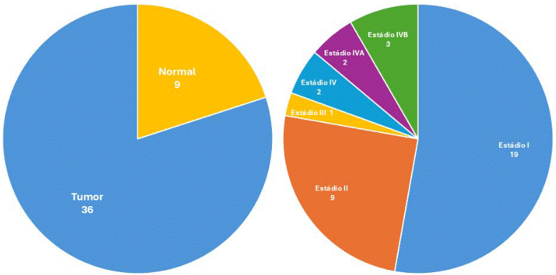 A Figura 1 apresenta a composição da amostra, com a proporção entre tecidos tumorais e normais (A), bem como a distribuição dos pacientes com CHOL segundo o estadiamento clínico (B), incluindo os estádios I a IV.