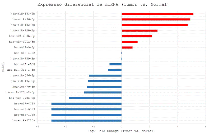 A análise de expressão diferencial, conduzida por meio da plataforma UALCAN, revelou perfis distintos de regulação gênica. A Figura 2 apresenta um gráfico de barras com os valores de log2 fold change dos miRNAs entre tecidos tumorais e normais.