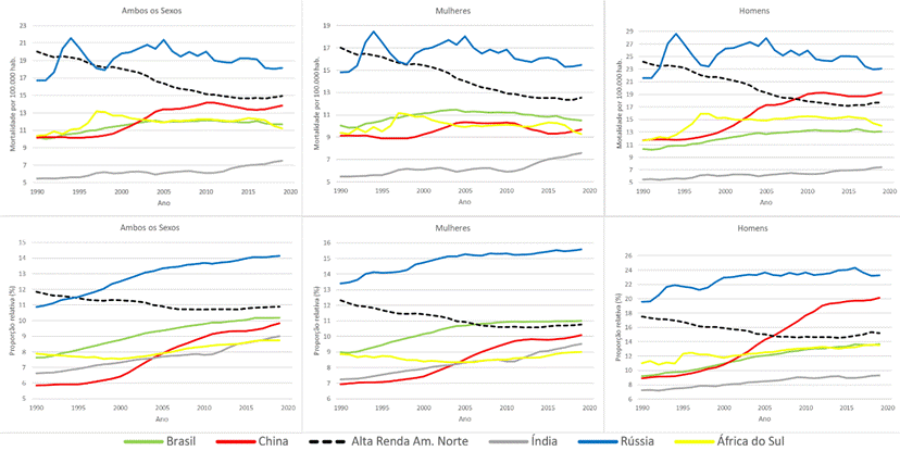 As trajetórias internas foram heterogêneas. A Rússia manteve as maiores TMPI, porém as reduziu após 2000. China e Índia concentraram o acréscimo absoluto de óbitos, com elevações relativas de 26 % e 27 %. O Brasil teve aumento moderado (12 %) seguido de estabilização, enquanto a África do Sul permaneceu praticamente estável, com discreto declínio entre mulheres.