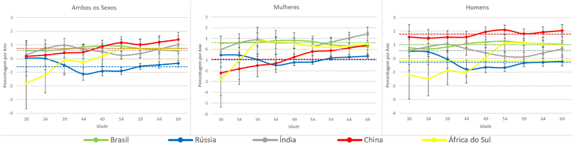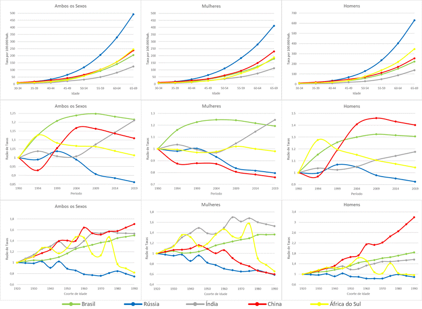 No padrão etário (local drift), destacaram-se aumento feminino de 30-39 anos e masculino de 45-54 anos na África do Sul; queda de 45-54 anos em ambos os sexos na Rússia; e elevação persistente de 50-59 anos entre homens chineses. Tais padrões apontam coortes economicamente ativas como alvo prioritário nos países em ascensão e sugerem a eficácia das estratégias russas iniciadas nos anos 2000 (Figura 2).